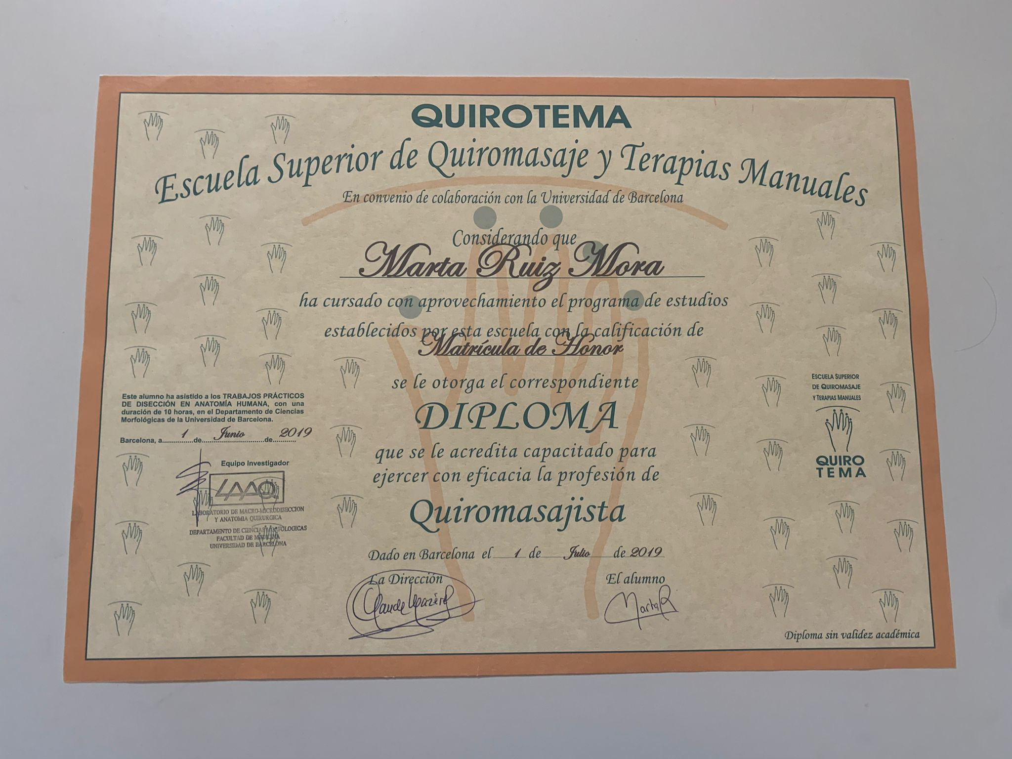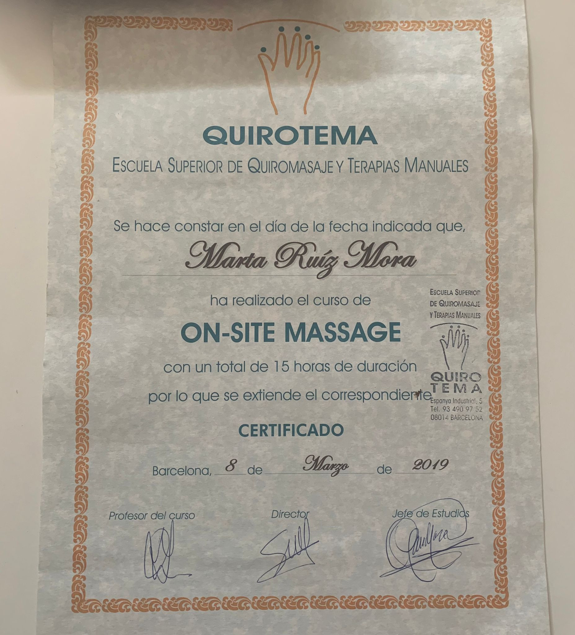 Tengo el título de quiromasajista i masaje on-site (Escuela Quirotema de Barcelona) con matricula de honor. He podido trabajar por mi cuenta y en el balneario AIRE de Vallromanes.