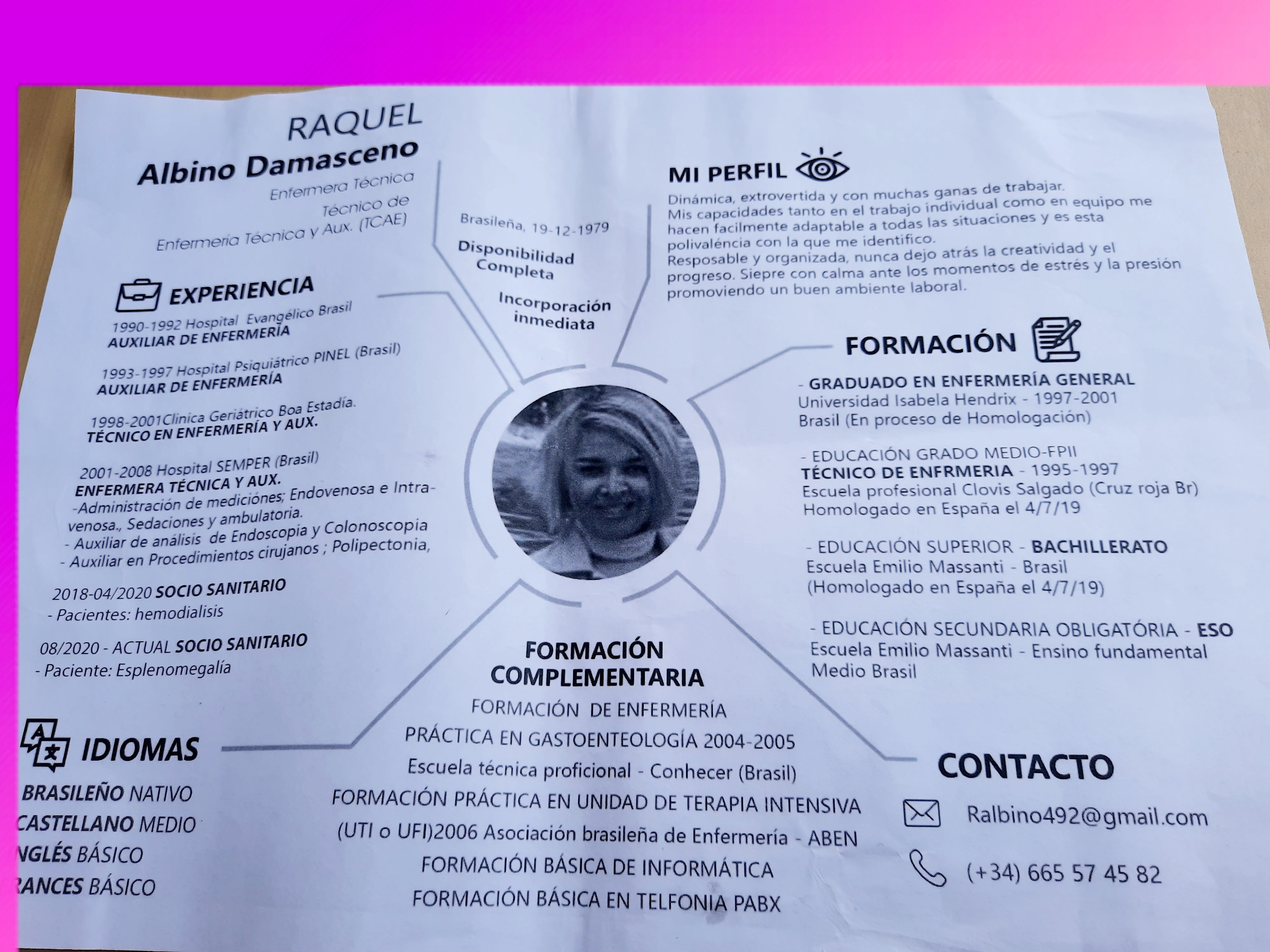 Hola soy Raquel técnico yauxiliar de enfermería tenga 8 años en me profesión me describo