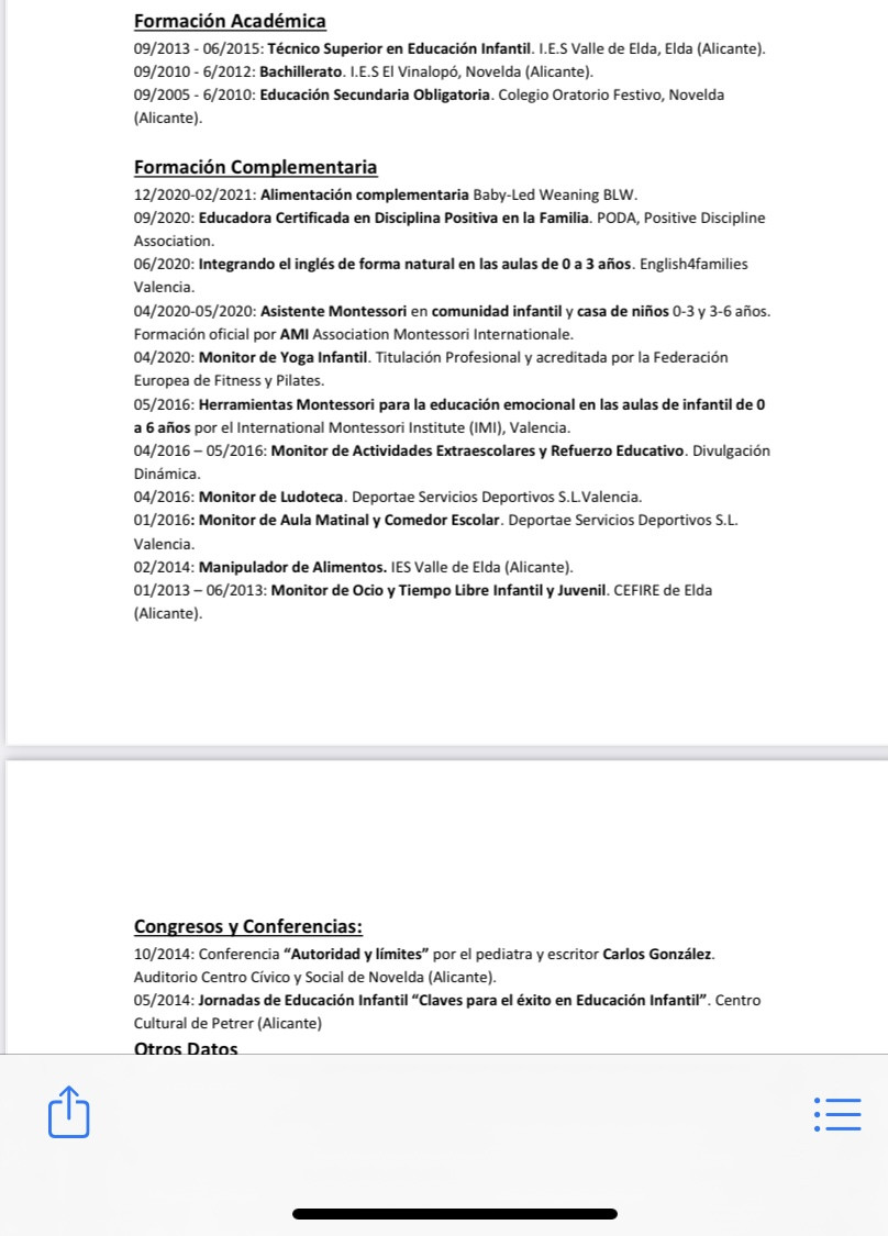 Soy Técnico Superior en Educación Infantil y estoy especializada en pedagogía Montessori (formación oficial); también soy Educadora Certificada en Disciplina Positiva. Tengo formación como Monitora de Ocio y Tiempo Libre y en yoga infantil; además de otras formaciones relacionadas con la educación y la infancia.